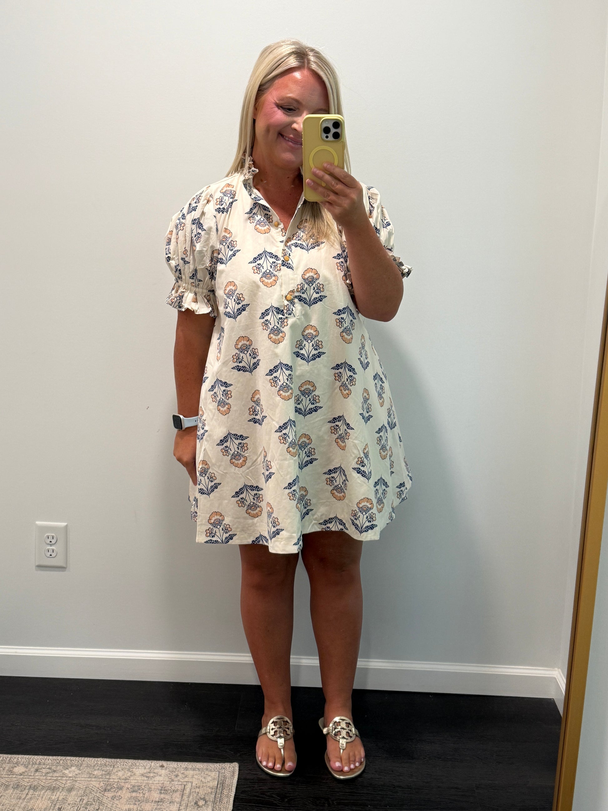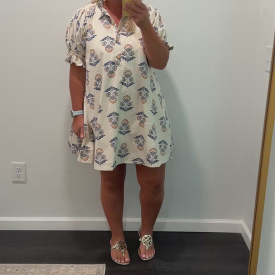 Women's cream floral mini dress with ruffle sleeves - perfect for brunch, fall game days, or vacation style. Lightweight & effortlessly chic.